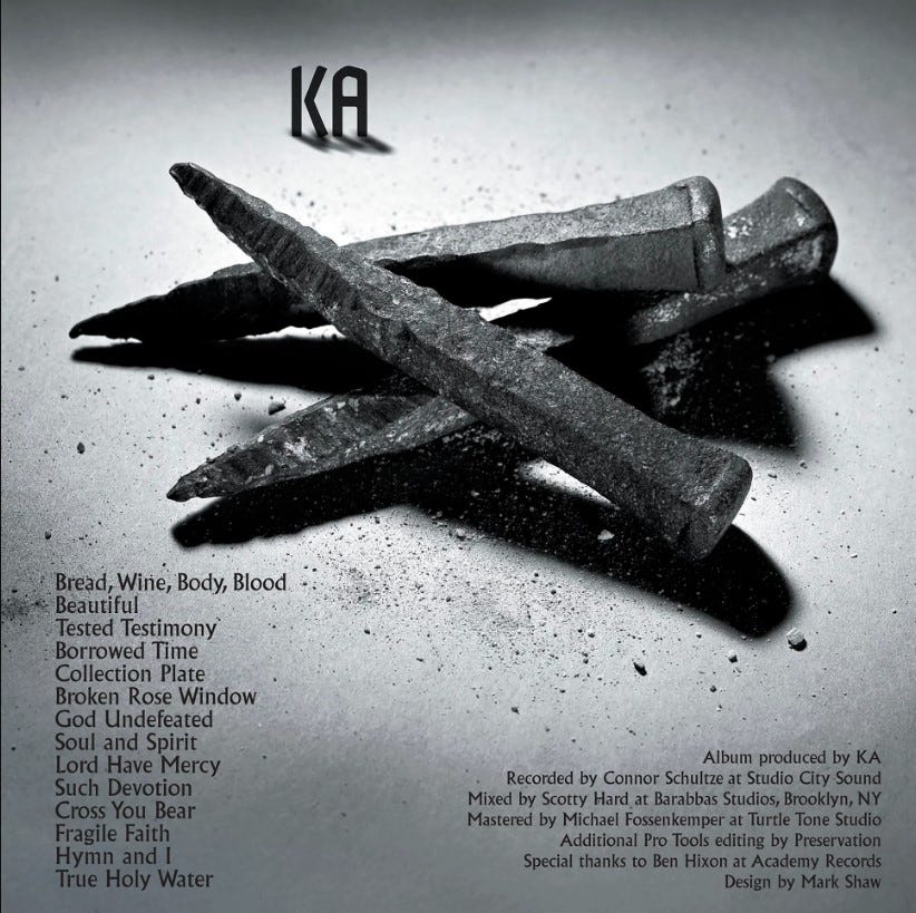 The Thief Next To Jesus is Ka’s gospel where he mines the genre of Gospel, in all its mystery unfounded Christianess, the longing, the wails, the beauty, the musical power of Black American root, it’s Blues, to exclaim his insights. The LP begins another LP where his musical production is as immediately sublime as his scroll of verses. Musically, it must be noted that all of Ka’s Iron Works begin with his rasped and tempered voice that conveys itself emotively and compassionately. There are few voices that speak so vibrantly sincere to those who directly relate to his poverty and hells overcome and to those who endearingly empathize and relate. And so the songs write into its sounds crafted…There is the bluesy pulls and womps of “Bread Wine Body Blood” where the ever non-didactic Ka can share a blatant diatribe against the extreme violence and sexualization of our music, “I had to tell you, that's on the path to failure roadmap/ It ain't the way to no goals, it's a chokehold, slow tap/The gist of this is to keep submissive and broke rap/ Another poison message, you holdin' precious, cause you're toe tap…” to a summarized chorus line of “It's the shared struggle that we all go through/ Don't be the weapon they use to harm you.” The harmonizing humming in varying octaves, “Oh, help me lord!” on “Fragile Faith,” the pocket groove is just as fragile as on so many Ka songs. Where is the fucking pocket that he’s rapping on this and instead of finding it it’s that his lines are an attached oratory to the soul, alma con alma, as he verses, “ Watched by dice and snake eyes/ pray you have better luck in the sewer/ listening to the ruler/ hopin' I'll measure up/ placed in many sticky situations, but was never stuck/ I've been tried, hope I'm inside when the gates of heaven shut..” Ka’s verses always have a wordplay note to catch and/or a brilliantly clever word usage as “Wanted all the jewels, just wouldn't choose police bracelets” and so often followed by advise only salvaged to share by the grittiest of life moments, “Before council/ be doubtful/ don't speak if they seek statement.” The layering works his mission (“The pre-gun lands we brung hands, it's ammunition/ I plan my death before I plan submission/ Came to change man condition/ but one fan sufficient…” - “Borrowed Time”), his song arrangements creative going bar to chorus in a hymn on “Beautiful” (“They sling mud but you bring love, that's beautiful/ How did K become, I’m tryna give the baby somethin' beautiful/ Abundant, ugly in this world, I come and make it, beautiful/ Your heart's a ruin if the parts you're doin' ain't, beautiful..”) or the spoken verses, always pensive, on the wooing and yelling of “True Holy Water” (“I'm thrilled, cause I don't need appeal to a real few I speak a bitter loss and once I get it off, I feel new/I was born to pen bars, not sure if these songs are memoirs…”), the word usage is subtly astounding (“Advance lines/ about the last times/ I had to relent/ since conceived/ believed/ some things, it's too bad to repent/ Was charmed, had a moms to rejoice, a dad to resent/ Knew it was all about a dollar before I gathered a cent…” - “Hymn and I”) as it constantly layers him into profound insights of melody (“These gardens hardened a heart that was tender” - “Such Devotion”). The ability to produce an vocal break groove and then rhyme in a successive, ever driving manner, keeping his calm, understated tone is a crucial component of his unique stylistics and is exemplified on “God Undefeated” diving into a “Jesus” wail and a cut organ stab wave with “No battle was light, tryna fight the fast/ Believe wicked in the lead, nothing nice can last/ No emotin' emotions, I like to mask/ Came to bring you singles, left a righteous path/ Over here they riff, from many sites to wrath/ Goals once thought unattainable, I might surpass…” And again the vocal loop and the piano chiming high on “Soul and Spirit,” you can hear Ka have his tone’s rasp serve its own hook as it inflects into a bass on the chorus, “We might be equal, but we not the same/ To absorb loss, there's a lot to gain,” give us something to mull over (“Is it patience or time wasting?) and just exquisitely pens, “All these dope concerns stressed the buck/ True wounds, I dressed it up” that are infused with soul as he pauses extended in remembrance. There is the gorgeous choir and lead that marches “Such Devotion,” where he truly humanizes some of the worst done for a better sum in such a brief set of bars for it to be done, “When you're broke crushing coke don't take much coaxing/Cooking the raw is a foot in the door, tryna bust it open/ But dudes ain't making moves, our view is just commotion…” There is a formula now known from Ka and maybe some can duplicate it yet it demands sincerity, soul and love for our people. Who could bite this? That so many of us, this author surely, are influenced by it and inspired from its magnitude, is a blessing of creators’ creations inspiring other’s creations. Now Ka’s Iron Works are a part of a canon essential works. They may be ranked, rated and singled out but all of them are essential. The Thief Next To Jesus LP is another.